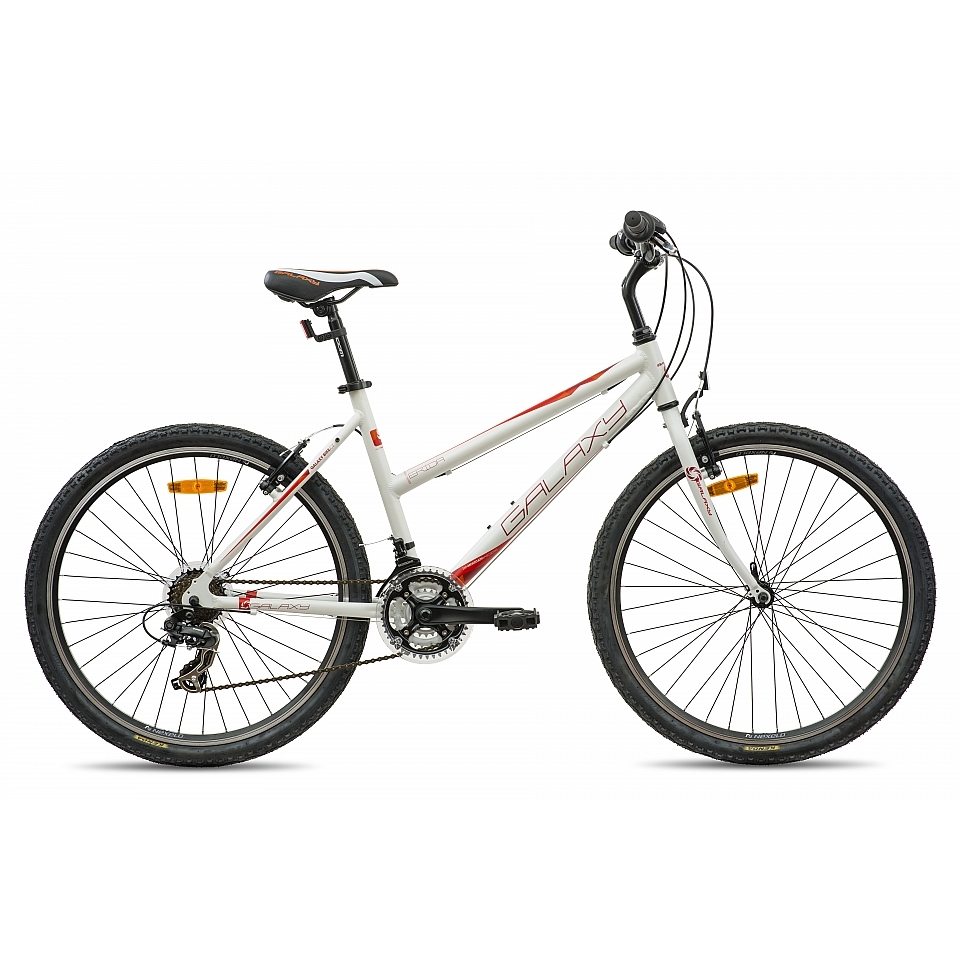 Dámské horské kolo Galaxy Erida 26" - model 2015 patří mezi kvalitní horská kola s odolným hliníkovým rámem. Přední pevná vidlice a brzdy Nexelo V-brake zaručují výborné jízdní vlastnosti. Dámské horské kolo Galaxy Erida 26" je osazeno kvalitními komponenty značky Shimano a nabízí 21 převodů. Díky těmto vlastnostem je dámské horské kolo Galaxy Erida 26" - model 2015 vhodné především pro jízdu v terénu, ale také po asfaltových silnicích.