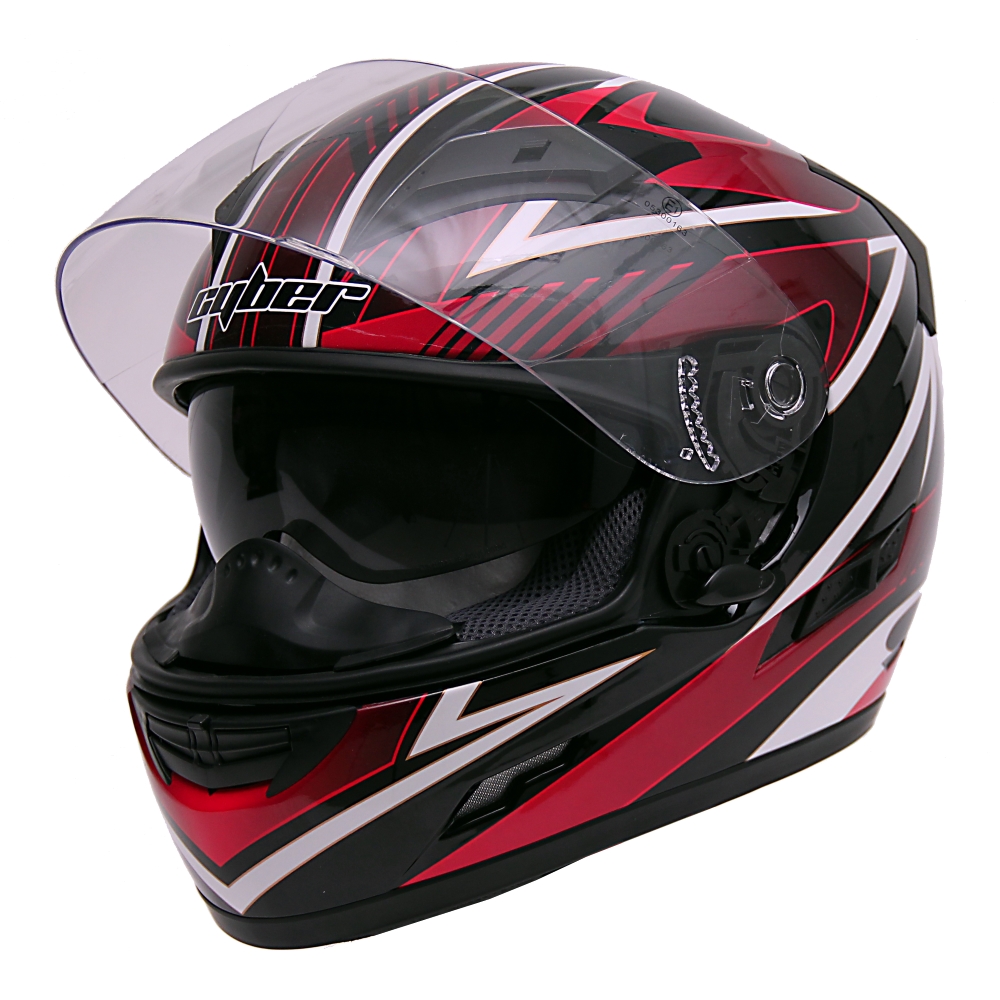 Dámská moto helma Cyber US 80 je sportovní integrální přilba s atraktivním designem. Je vyrobena z extrémě pevného materiálu APC, který je maximálně odolný vůči prudkým nárazům a vysokým teplotám. Mezi hlavní vlastnosti přilby patří aerodynamický tvar, který zaručuje minimální odpor vzduchu při jízdě a zabraňuje vzniku rušivých turbulencí. V neposlední řade helma je vybavena vnitřní sluneční clonou, jejíž mechanismus lze jednoduše spustit boční straně skořepiny. Podbradní řemínek je vybaven praktickou mikrometrickou sponou, čímž je umožněno pevné a dobře nastavitelné zapínání. Vnitřní výstelka je vyrobena z kompletně vyjímatelného a vypratelného antialergického materiálu. Helma je vybavena nosním deflektorem, který zabraňuje přímému zamlžování plexi. Spodní bradový deflektor zabraňuje hlučnosti helmy. Důkladně propracovaná uzavíratelná ventilace zajišťuje dokonalé proudění vzduchu a svěží vnitřek helmy. Dámská moto helma Cyber US 80 je homologovaná podle zákona ECE 22-05, čímž splňuje vysoký bezpečnostní standard.