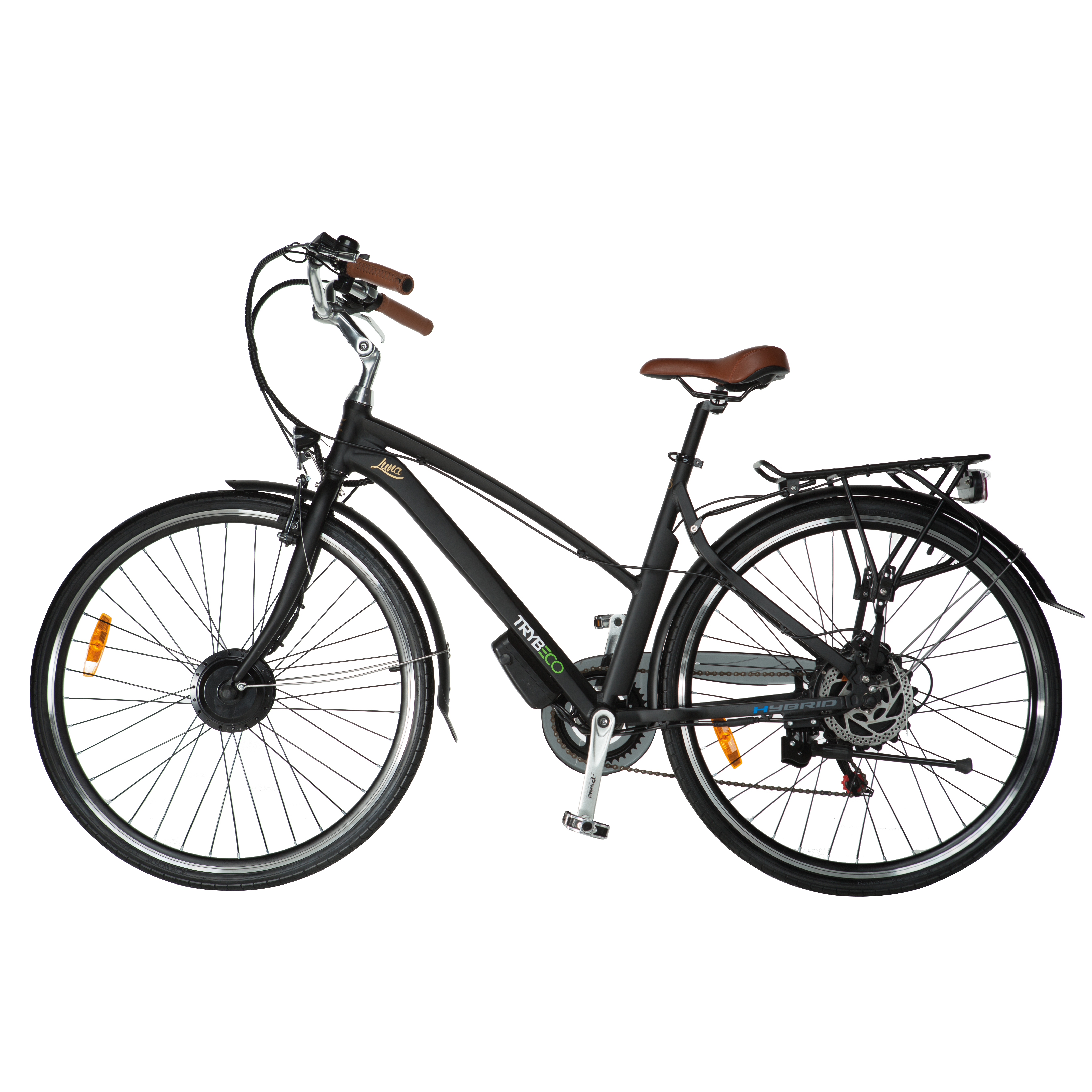 Dámské trekingové elektrokolo TrybEco Luna 28" přináší Vaší jízdě na kole každodenní komfort - velká 28" kola a elektronická podpora šlapání Vám ulehčí jízdu a Vy tak budete mít ještě větší radost z cestování na sedle kola. Napájení obstarává 8 Ah baterie speciálně umístěná v zadním náboji, zatímco motor 8FUN je naopak v náboji předním. Díky tomu je dojezd až 100 km v závislosti na profilu tratě a způsobu využití asistence. Tato konfigurace s nízkým těžištěm se také pozitivně odráží na jízdních vlastnostech a celkovém vybalancování kola. Navíc i designově působí lépe než akumulátor umístěný na rámové trubce či na nosiči. Určitě potěší i široká výbava, mezi kterou patří praktický zadní nosič, zvonek a světla pro vyšší bezpečnost nebo madla řídítek a sedlo provedené v kůži. Krásně tvarovaný rám, stylový, moderní a elegantní vzhled, to je působivé dámské trekingové elektrokolo TrybEco Luna 28".