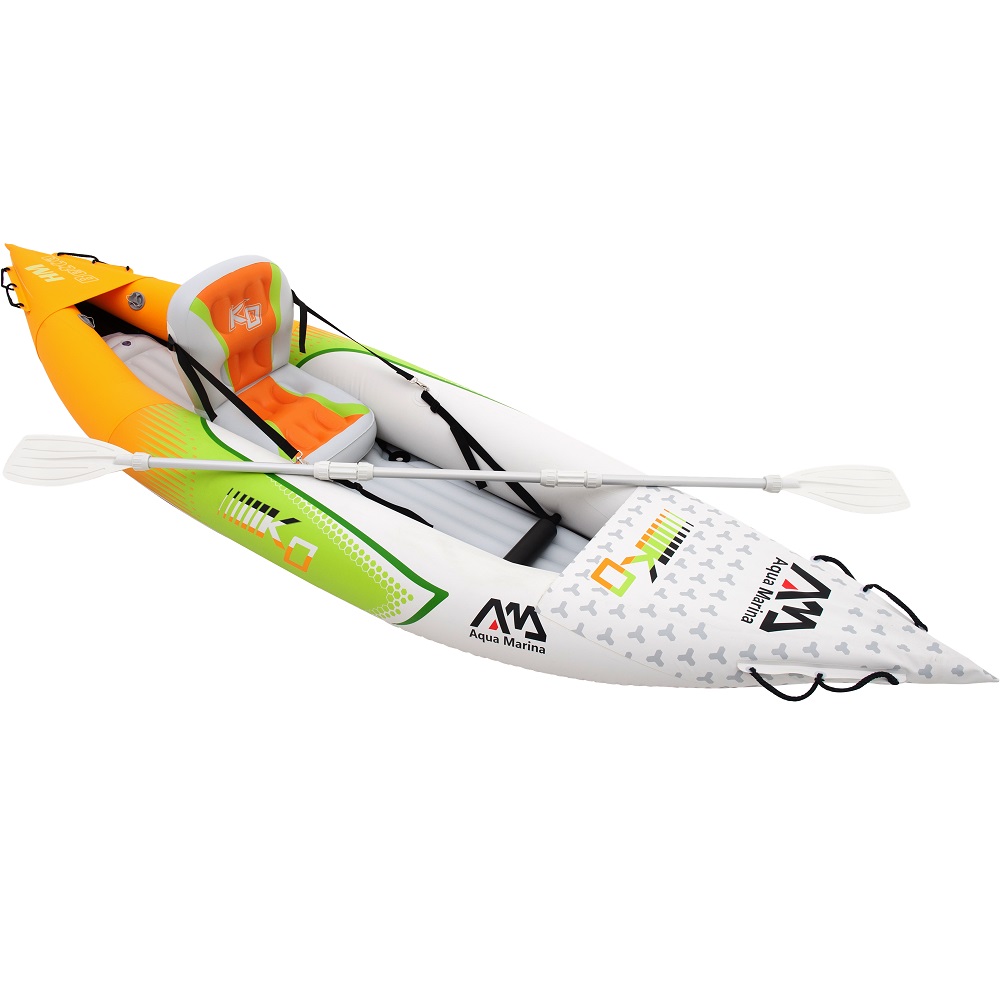 Nafukovací kajak Aqua Marina Betta HM K0 jednomístný je skvělý rekreační kajak pro každého, kdo se těší na vodu. Je vhodný pro začínající i mírně pokročilé vodáky. Tento kajak klade důraz na dobrou ovladatelnost a rychlost při zachování komfortu a stability. Výborně poslouží na rybnících, jezerech a pomalých řekách. Pro aktivně strávené chvíle s rodinou nebo přáteli je tedy ideální. Nafukovací kajak Aqua Marina Betta HM K0 je vyroben z vyztužené PVC tkaniny, disponuje pohodlným sedadlem s plně nastavitelným opěradlem, opěrou pro nohy a trvanlivou "i-beam" podlahou pro stabilitu. Příď je opatřena ochranou proti vnikající vodě. V neposlední řadě jeho konstrukce v kombinaci s nosností 95 kg poskytuje i dobrou skladovací kapacitu. Díky zapuštěným ventilům lze kajak snadno a rychle nafouknout a vyfouknout za méně než deset minut. Celý kajak pak můžete snadno přenášet v přiložené brašně. V balení nechybí ani nožní pumpa, kajakové pádlo či opravná sada.
