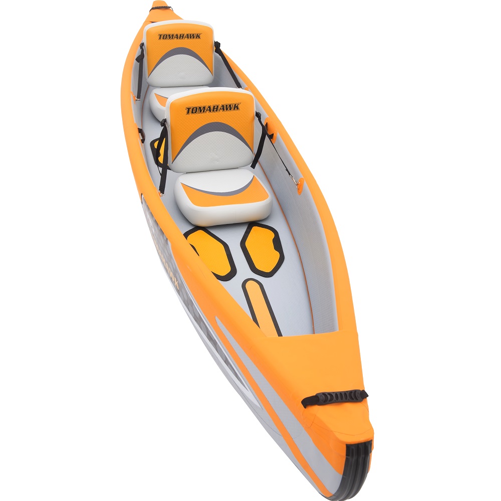 Nafukovací kajak Aqua Marina Tomahawk dvoumístný je extrémně pevný kajak, který pozvedá rekreační vodní radovánky na novou úroveň. Vysoké pevnosti bylo dosaženo díky vyztužené PVC tkanině a "drop-stitch" technologii, která se využívá například u paddleboardů. Kajak se tak svými jízdními vlastnostmi a možnostmi využití blíží těm z pevných materiálů, a to při zachování výhod nafukovacích - bezproblémového skladování, snadného transportu a nízké hmotnosti. Je tak vhodný pro vodáky všech dovednostních kategorií. Tento kajak klade důraz na ovladatelnost a rychlost při zachování komfortu a stability. Konstrukce napomáhá skvělému držení stopy, ale loď zároveň rychle reaguje na změny směru a rychle se vrací do stabilní polohy. Nafukovací kajak Aqua Marina Tomahawk disponuje sedadly s plně nastavitelným opěradlem, dvěma vypouštěcími ventily a madly pro přenášení. Se svou nosností 220 kg a dostatkem úložného prostoru je kajak vhodný i na delší výlety. Tento kajak je navržen pro použití i v divočejší vodě na řekách nebo jezerech.