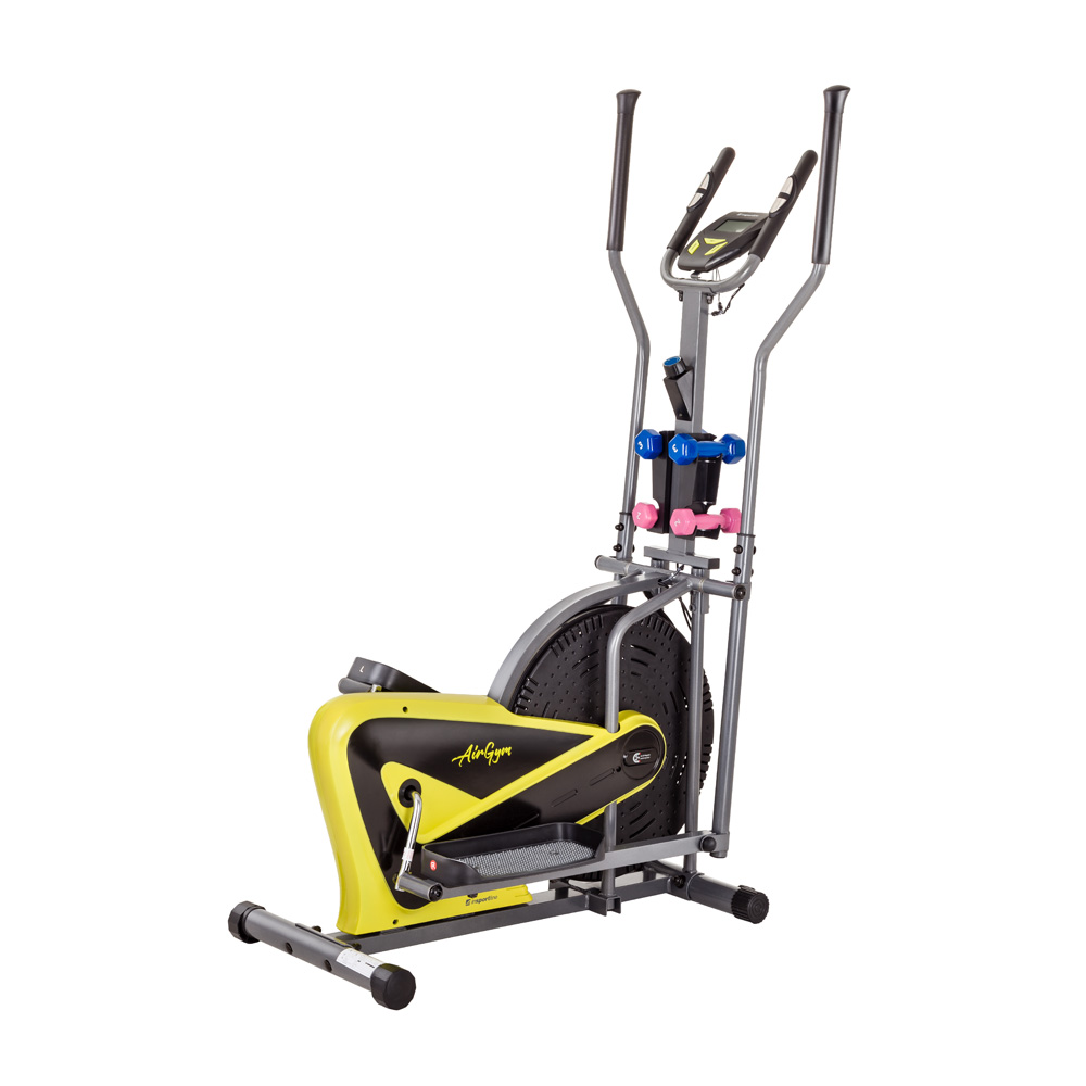 Eliptický trenažér inSPORTline Airgym je skvělým prostředkem pro domácí cvičení. Zátěžové kolo o hmotnosti 2,5 kg funguje na principu třecího odporu, který poskytuje brzdný systém. Je vybaven jednoduchým počítačem s přehledným displejem a intuitivním třítlačítkovým ovládáním. Displej zobrazuje veškeré podstatné informace o cvičení jako je čas, spálené kalorie, vzdálenost, aktuální rychlost, tepová frekvence a odometr. Rovněž lze nastavit funkci scan, která mezi těmito jednotlivými ukazateli pravidelně přepíná. Tepová frekvence je měřena pomocí zabudovaných snímačů v madlech.