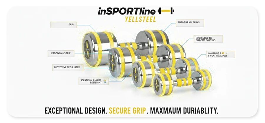 Máte rádi chromové činky, ale hledáte něco speciálního? Necháváte si záležet při vybavování své posilovny i na vzhledu veškerého náčiní? Chromová činka inSPORTline Yellsteel může být tou správnou volbou!