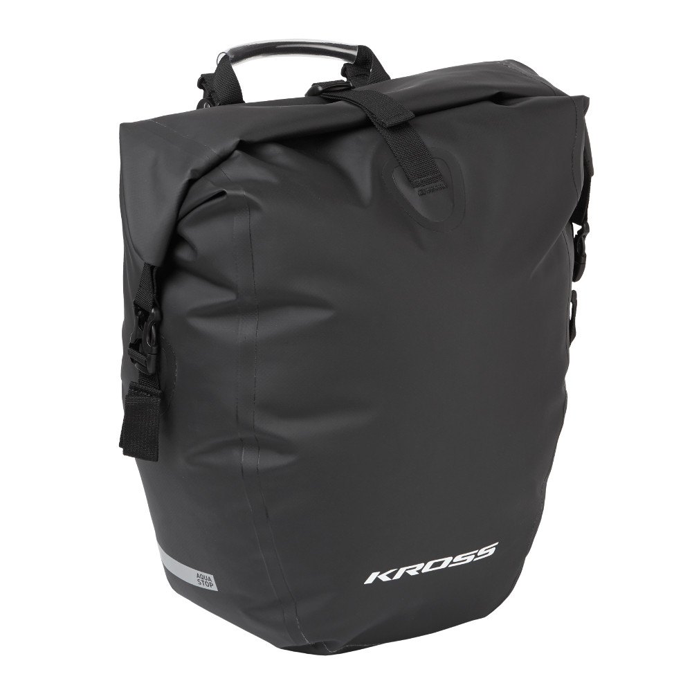 Kross Aqua Stop Rear Pannier Bag 25,4l je větší nepromokavá brašna na nosič s poloautomatickým upínacím systémem. Díky tomu můžete brašnu z nosiče jednoduše sundat pouze jednou rukou. Díky nastavitelným přezkám přizpůsobíte brašnu prakticky každému druhu vodorovného nosiče, stejně tak jako různým průměrům příček. Brašna má také praktickou rukojeť.