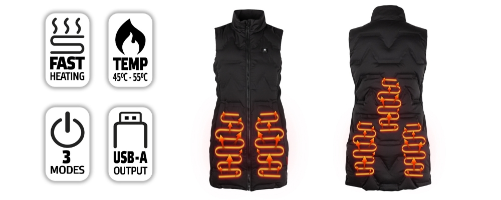 Dámská vyhřívaná vesta inSPORTline WARMelong s prodlouženým střihem a její rafinovaná vyhřívací technologie Active Heat Core System Vás udrží v teple i v tom nejchladnějším počasí. Vyhřívání obstarávají speciální karbonová vlákna, která jsou umístěna v oblasti břicha, beder a střední části páteře. Krom rovnoměrného rozprostření tepla mají díky vyzařování infračervených paprsků také blahodárné účinky na správnou funkci krevního oběhu.