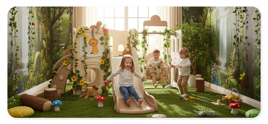 Bezpečné interiérové hřiště pro malé dobrodruhy. Houpačka, klouzačka i tabule na kreslení. Odolný nezávadný materiál, interaktivní a bezpečnostní prvky. více