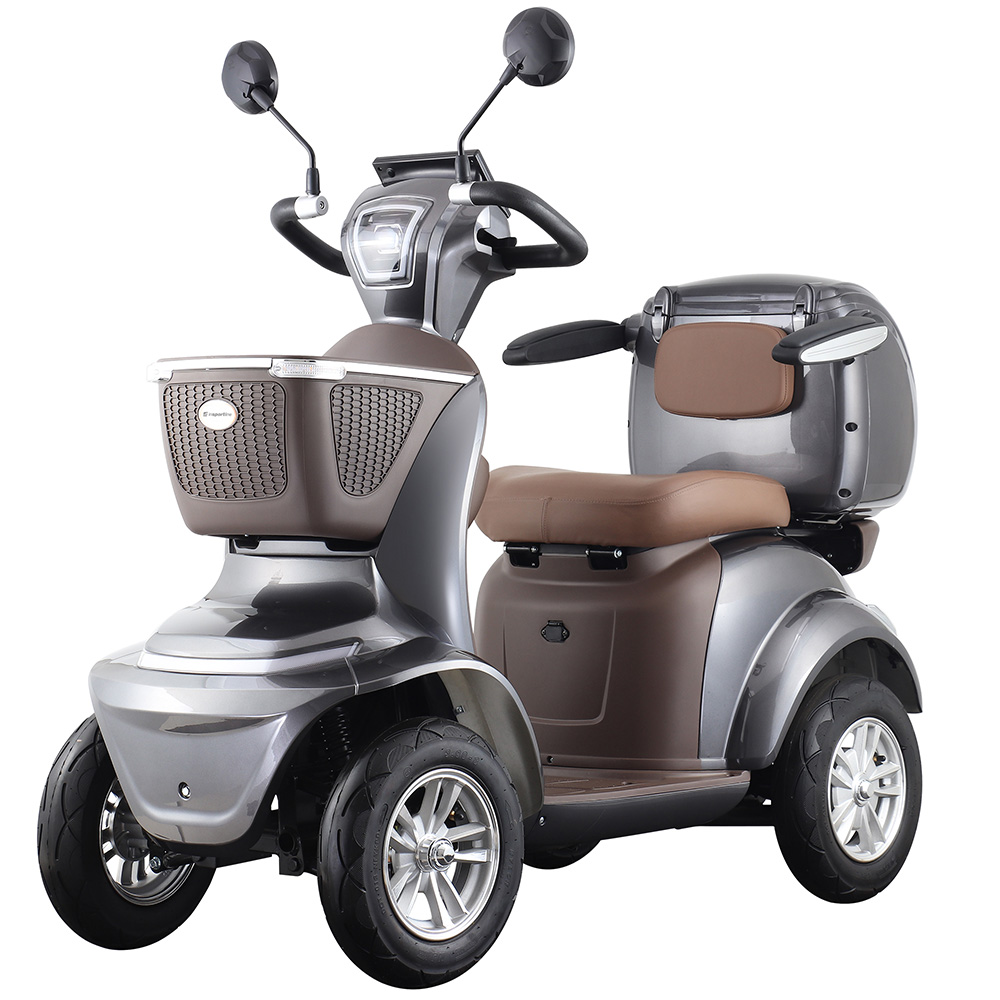 Bezkartáčový motor s výkonem 500W a silnou 20 Ah baterií umožňují vozíku dojezd až 45 km. Kombinace intuitivního páčkového ovládání rychlosti spolu se dvěma rychlostními režimy - 10, 20 km/h a s velkým podsvíceným digitálním displejem, zaručují maximální kontrolu nad jízdou. Spolehlivé elektromagnetické brzdy a kompletní osvětlení s blinkry zajišťují vysokou bezpečnost na silnici. Nechybí ani zadní pomocná kolečka proti převrácení.