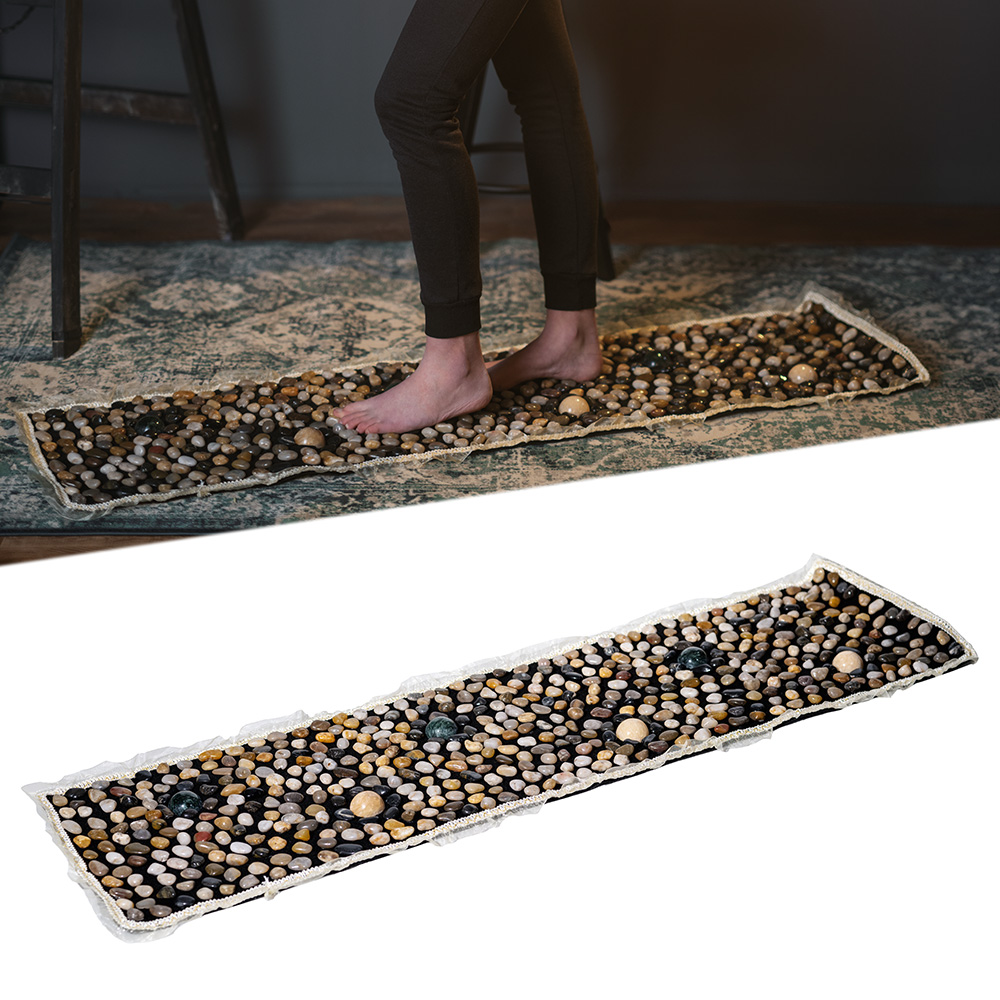 Jestli se vám bude zdát samotné chození po kamíncích příliš náročné, můžete si jen sednout a chodidla k podložce přitlačit. Masáž tak bude jemnější, ale stále účinná. Kromě kamenů má masážní kobereček několik zón s většími zaoblenými kameny pro stimulaci klenby chodidla.
