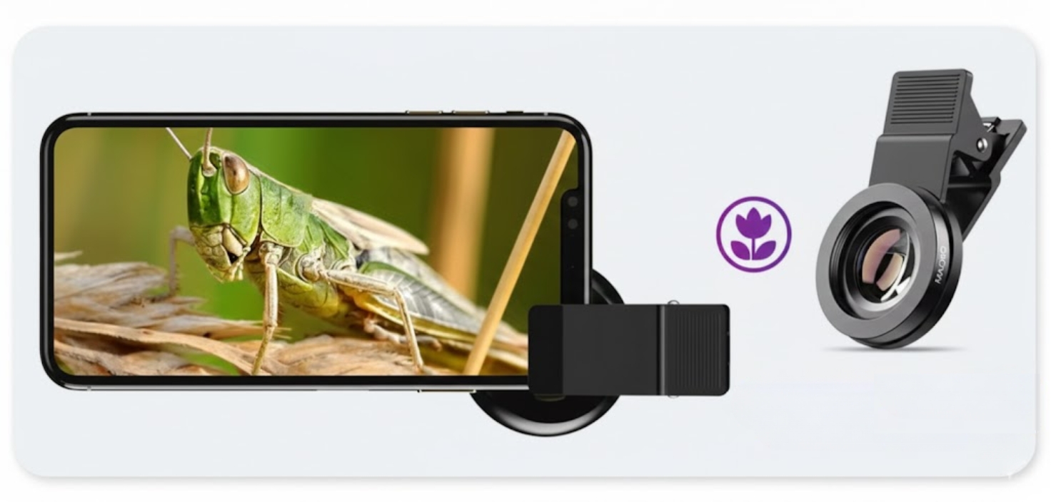 12,5x makro čočka umožňuje snímání extrémně detailních záběrů z velmi blízké vzdálenosti (přibližně 3–6 cm v závislosti na telefonu). Perfektní pro květiny, hmyz, textury látek, šperky nebo kapky rosy – výsledkem jsou ostré, jemné snímky s profesionálním dojmem, které na sociálních sítích skutečně zaujmou.