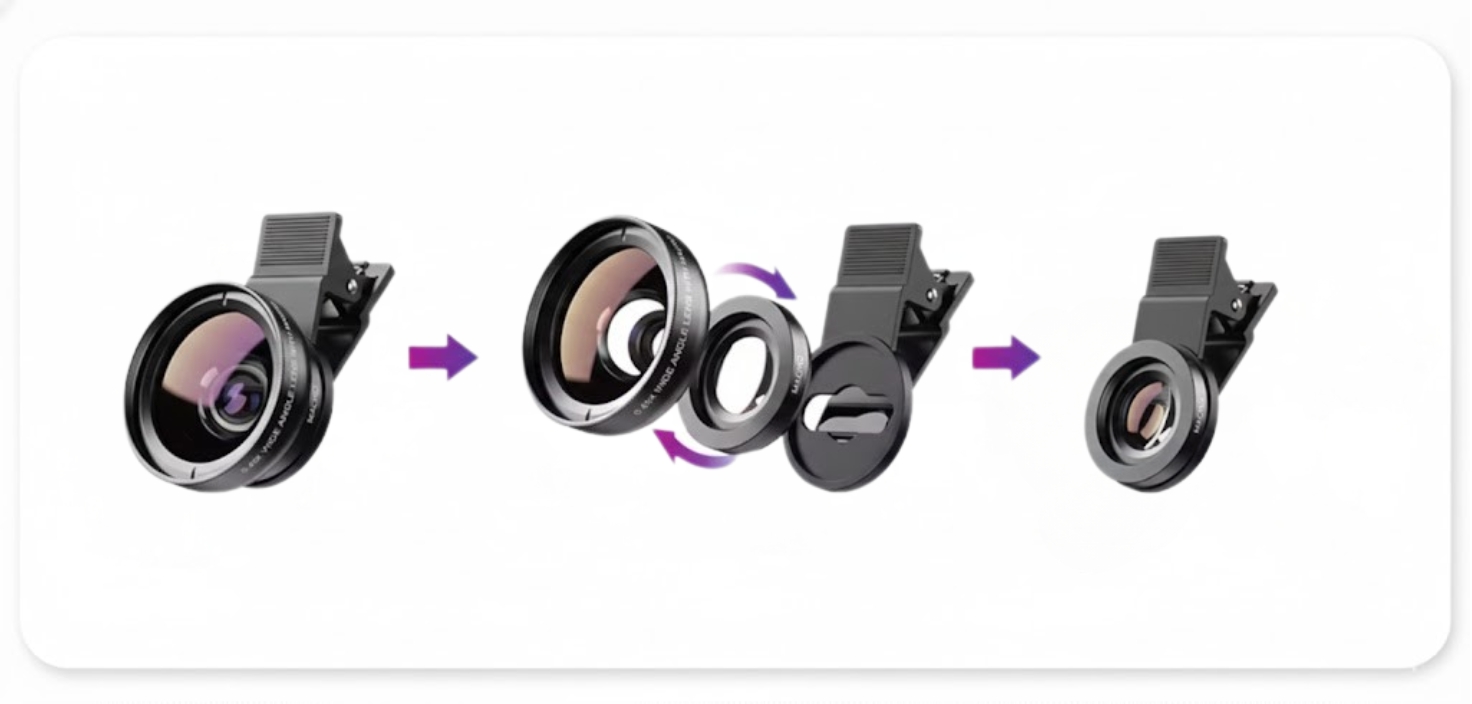 Univerzální clip‑on uchycení funguje s drtivou většinou telefonů a je opatřeno ochrannými vložkami proti poškrábání. Širokoúhlý objektiv se jednoduše našroubuje na makro část – sundáš vrchní kryt a hned máš makro připravené. Kompaktní rozměry a nízká hmotnost z nich dělají ideální doplněk na cesty i do města.