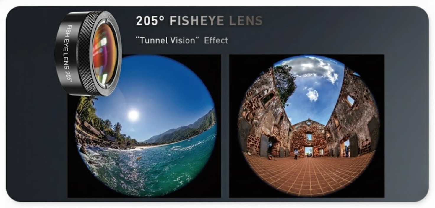 Čočka typu fisheye nabízí ultraširoký záběr až 205°, díky čemuž vytváří ikonický zakřivený efekt a působivé perspektivy. Hodí se na akční scény, street fotografii i originální selfie. Dokáže výrazně oživit fotografie a dodat jim hravost, kterou běžný fotomobil jednoduše nezvládne.